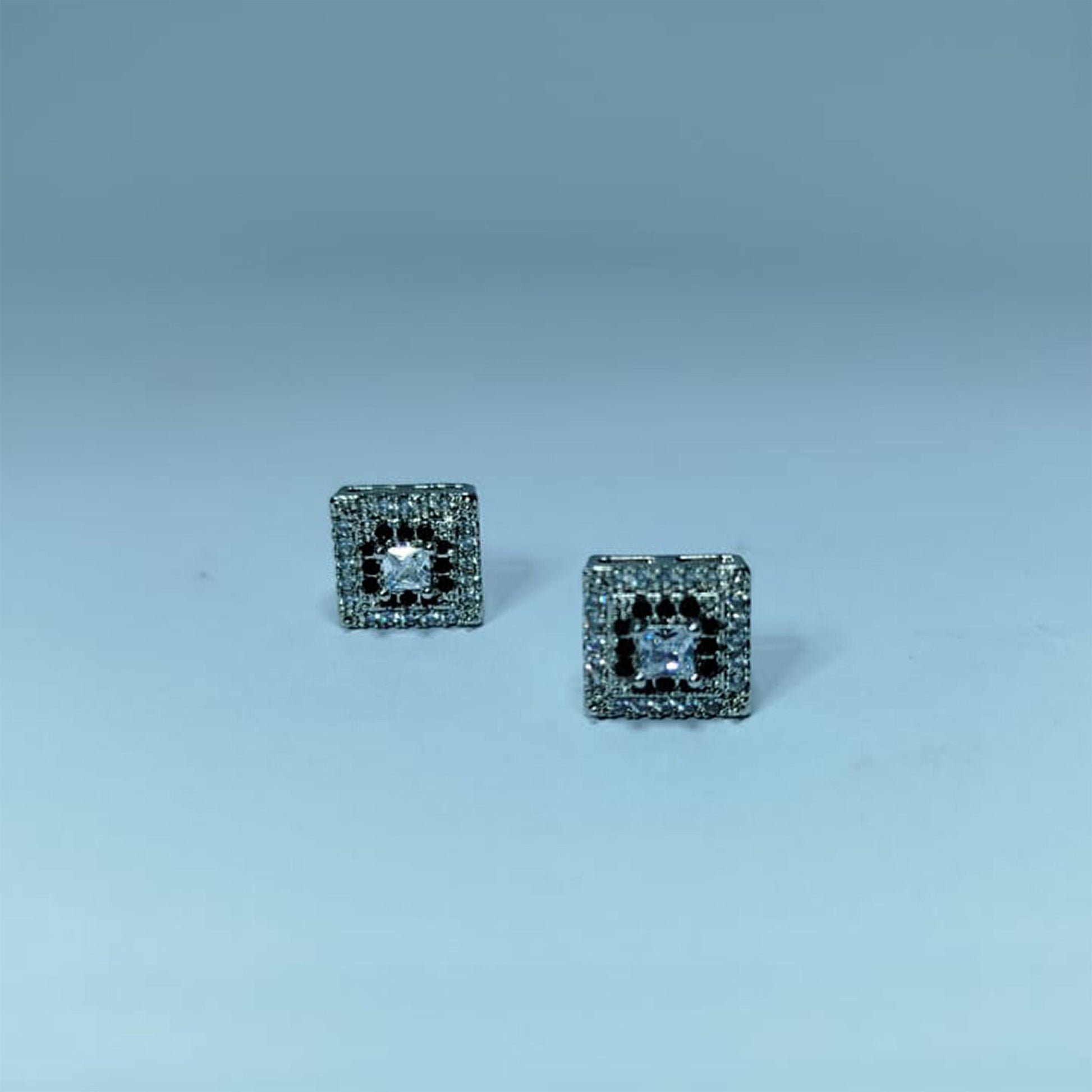 Sophisticated and timeless, these square stud earrings feature a striking black accent surrounding a radiant white stone, set in a silver finish. Perfect for adding a bold yet classy touch to your everyday or evening look.